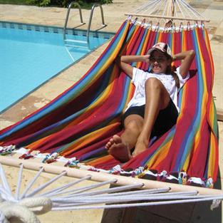 Udbredt dekorativ hængekøje i bomuldsstof med tværpinde i farvekombinationer.