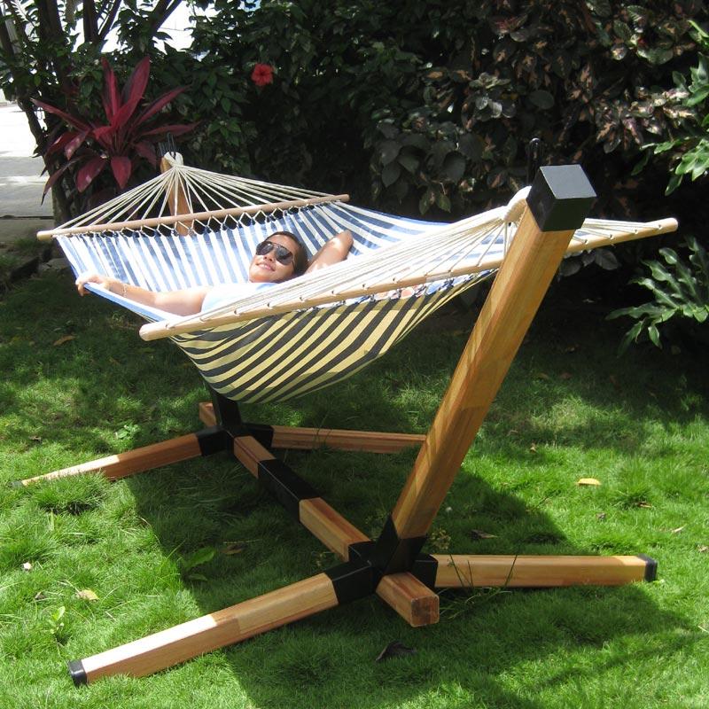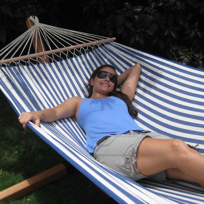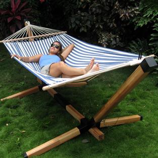 Super Lækkert Hængekøjestativ med blå og naturhvid i stribet hængekøje. Unik og fantastisk Komplet sæt der består af hængekøjestativ og hængekøje.