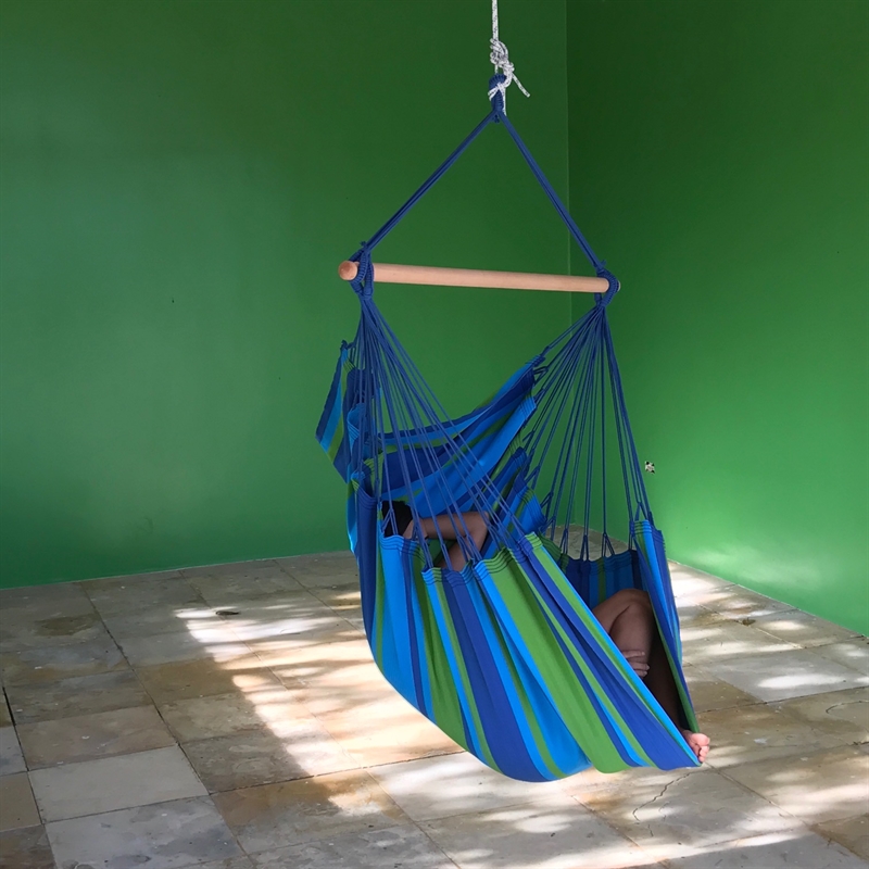 Elegant hængekøjestol i outdoor PRO materiale til både inde og udeliv. Du sidder oprejst i hængekøjestolen. Hængekøjestolen er meget velegnet til både indendørs og udendørs brug. Farverne er stærke og praktiske.