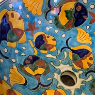 Håndmalet mexicansk håndvask og fiskene vil altid variere lidt fra håndvask til håndvask. Alle er håndmalet i Mexico. I denne store håndvask er der mange fisk der bevæger sig uophørligt rundt.