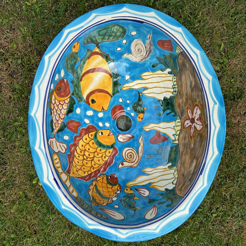 Unik keramiske mexicansk håndvask. Størrelse 55 x 43 cm. Farvevariant med fiske coral motiver.