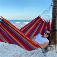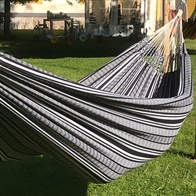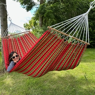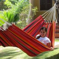 Den brasilianske hængekøje består typisk af et stort stykke stof i klare flotte farver. Det gør det lidt lettere at være flere personer samtidig i de store hængekøjer og du har mulighed for at have børnene med. Den er også god til aktiviteter som højtlæsning og amning.