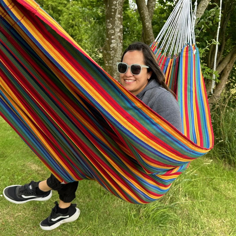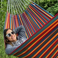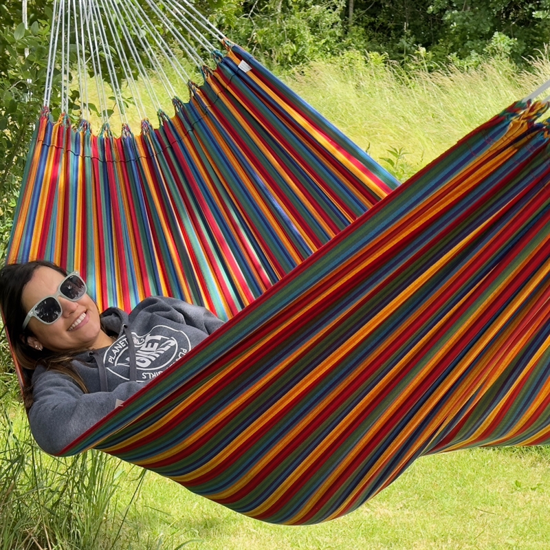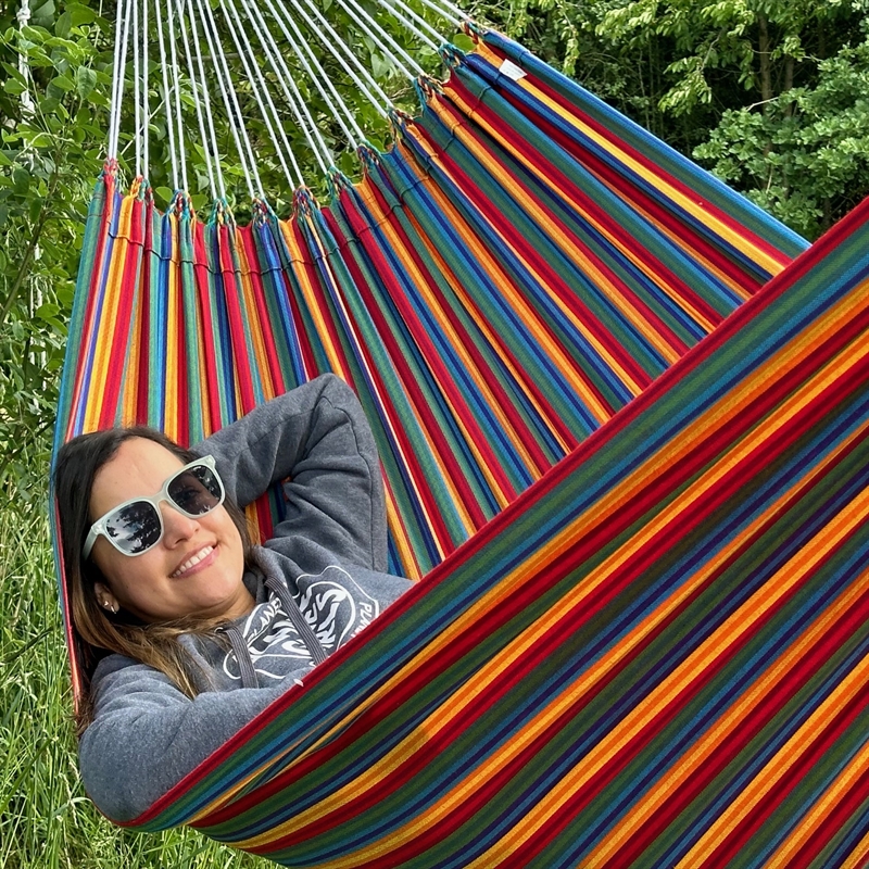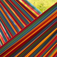 Meget flot charmerende hængekøje med de mange fine smalle striber i 100 pct. farveægte bomuldsstof