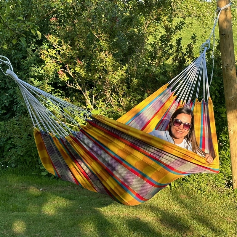 Ternet Stof-hængekøje til 1 eller 2 personer. Bomulds stoffet i friske farver, der er bredt og gør hængekøje måde indbydende og magelig.
