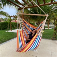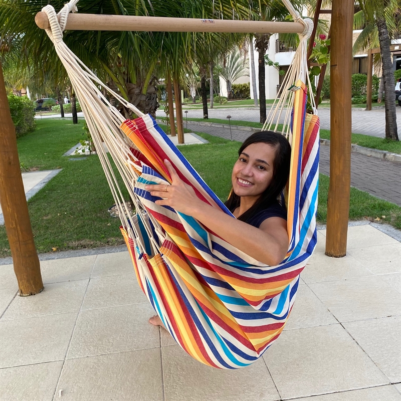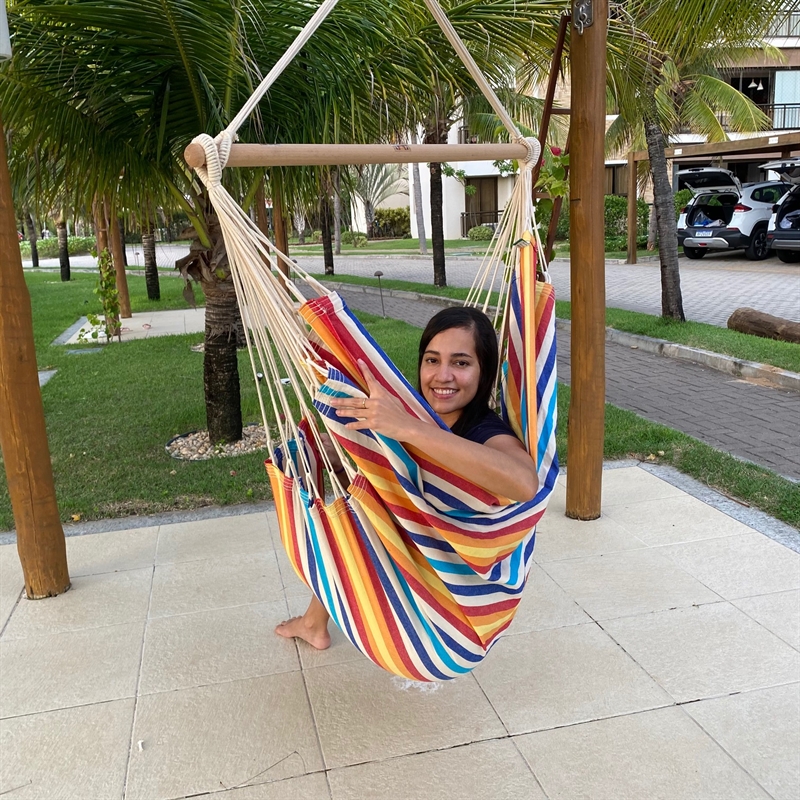 Stof kan vaskes og er i 100% ny bomuld. Ultimativ Sidde oplevelsen i denne hængekøjestol.