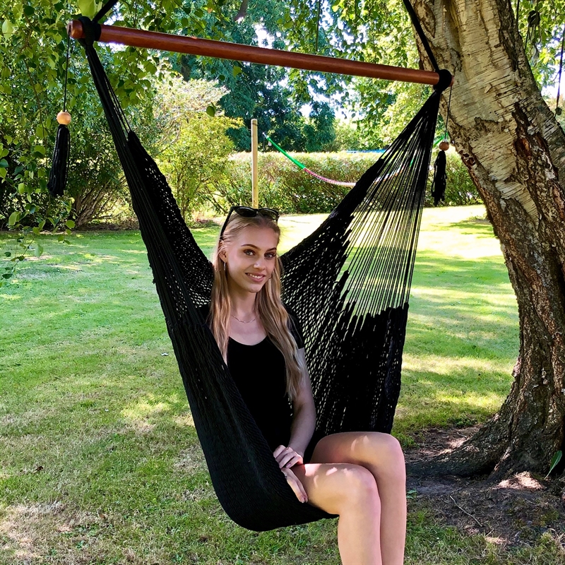 Net-hængekøjestole i en særklasse for sig selv. Unik, smidig og enkel hængestol med ét ophængningspunkt. Hængekøjestol i sort net.