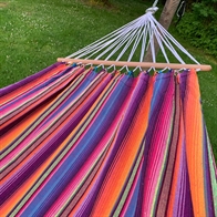 Den brasilianske hængekøje består typisk af et stort stykke stof i klare flotte farver. Det gør det lidt lettere at være flere personer samtidig i de store hængekøjer og du har mulighed for at have børnene med. Den er også god til aktiviteter som højtlæsning og amning.