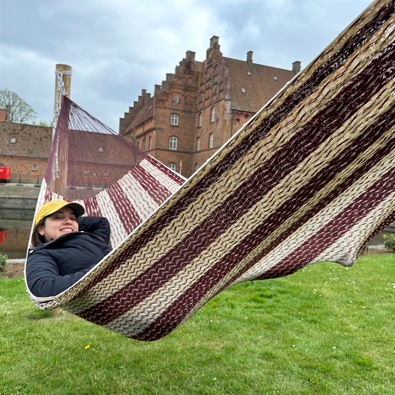 Hængekøjen er i Naturhvid og Vinrød. Made in Mexico - Yucatan.