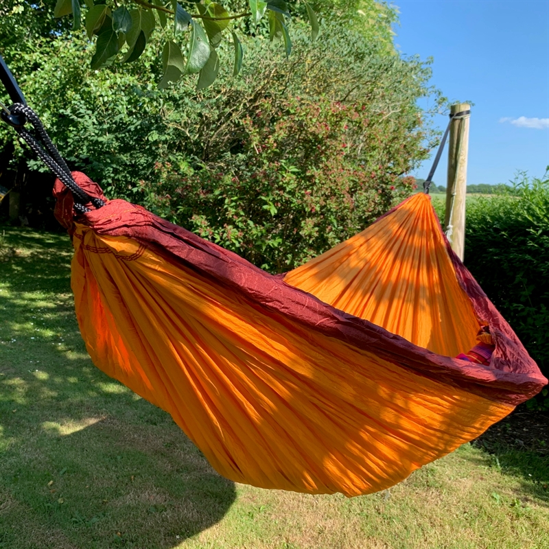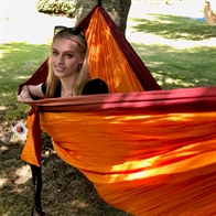Dobbelt hængekøje 285 x 200 cm. vinrød og orange hængekøje. Materialet er 100 % nylon (parachute silk). Ultra let faldskærmssilke. Hængekøje vejer 500 gram.