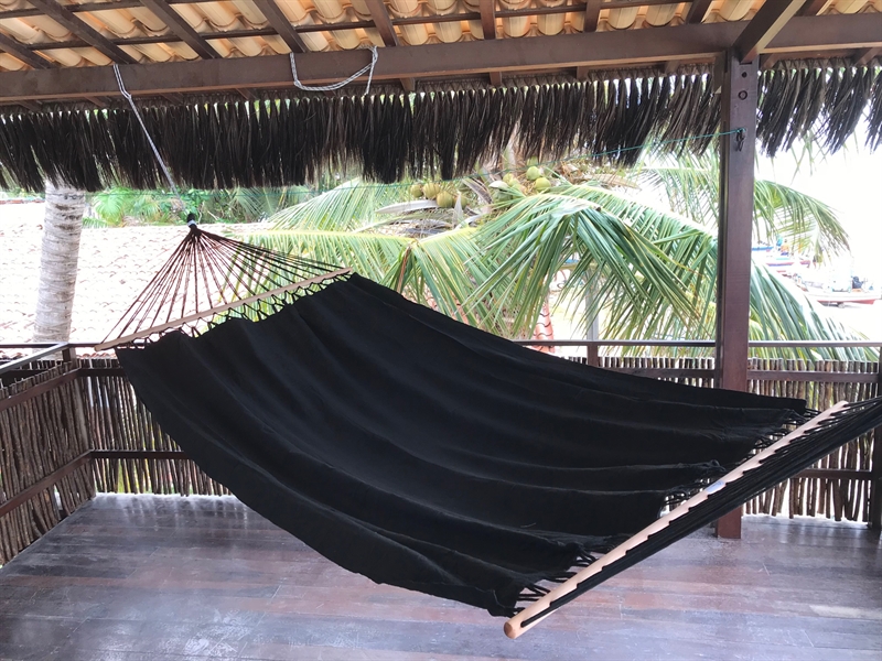Udbredt sort stof hængekøje i bomuld med 118 cm bredde rundstokke.