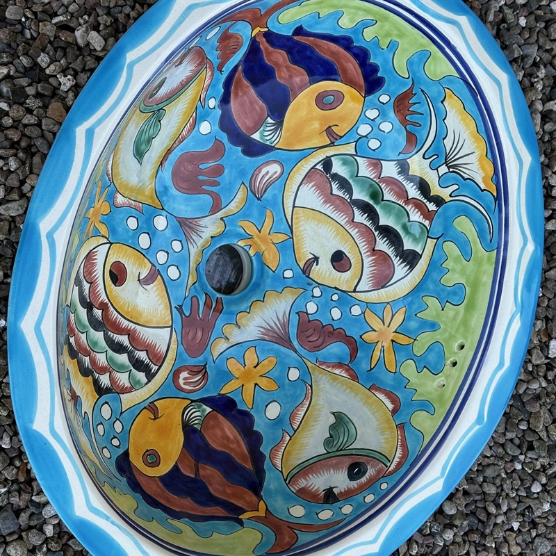 Alle er håndmalet i Mexico. I denne store håndvask er der et unikt fiskemotiv.