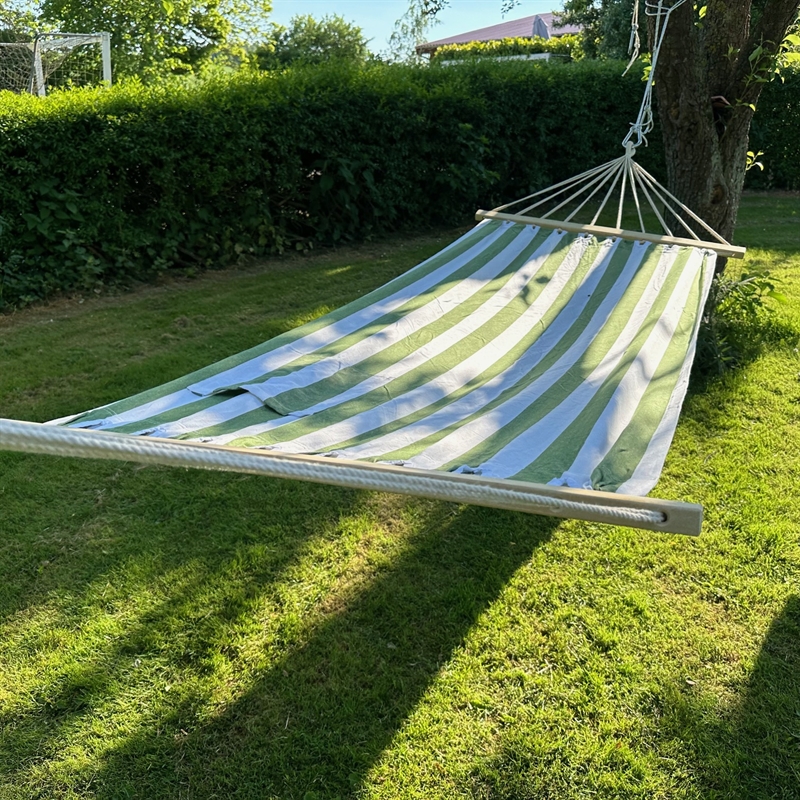 Stribet Grøn og Hvid Hængekøje med tværpinde i Stof