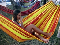 Ekstra stor stof-hængekøje med charmerende gyldne border. Et rigtig brasiliansk look.